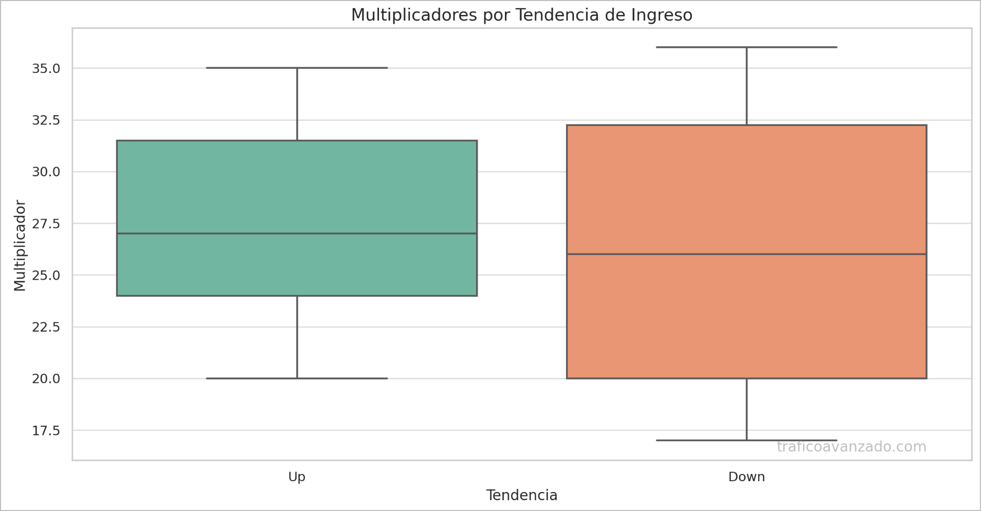 En el caso de los canales de YouTube, la historia es similar. Analizando todos los canales, noté que el tráfico iba en subida en aproximadamente un 30%, mientras que un 60% iba en bajada y muy pocos estaban estables. Si analizamos el multiplicador para ambas tendencias, veremos que el rango promedio se encuentra entre 24 y 31 para canales que tienen tendencia de subida, mientras que el rango medio va de 20 a 31 en canales que tienen tendencia de bajada.