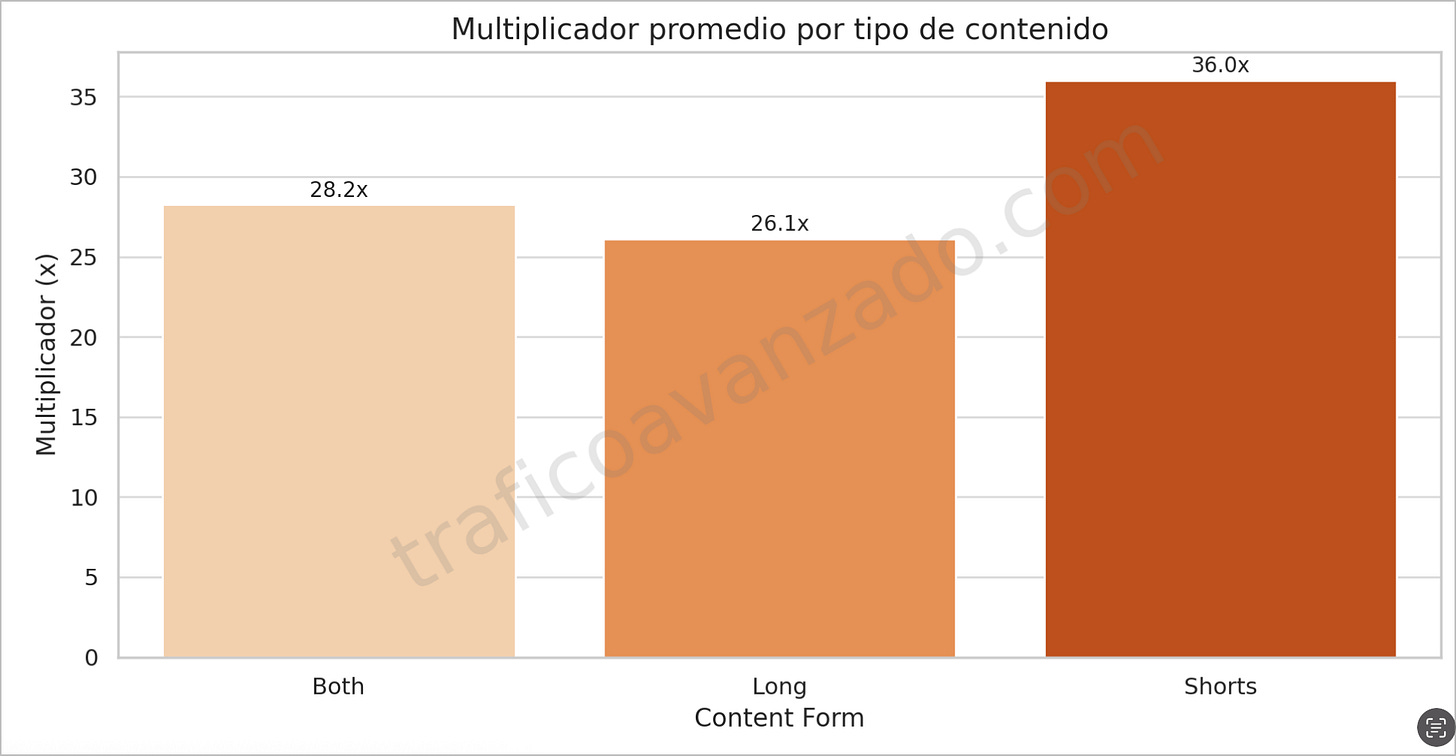 Me pareció importante analizar este dato, porque yo creía que el contenido largo iba a valer más. Sin embargo, como puedes ver, el multiplicador donde el contenido principal eran shorts tenía un multiplicador promedio de 36x, mientras que el contenido largo tiene un multiplicador de 26x y 28 para los canales que tienen una buena mezcla de ambos tipos.