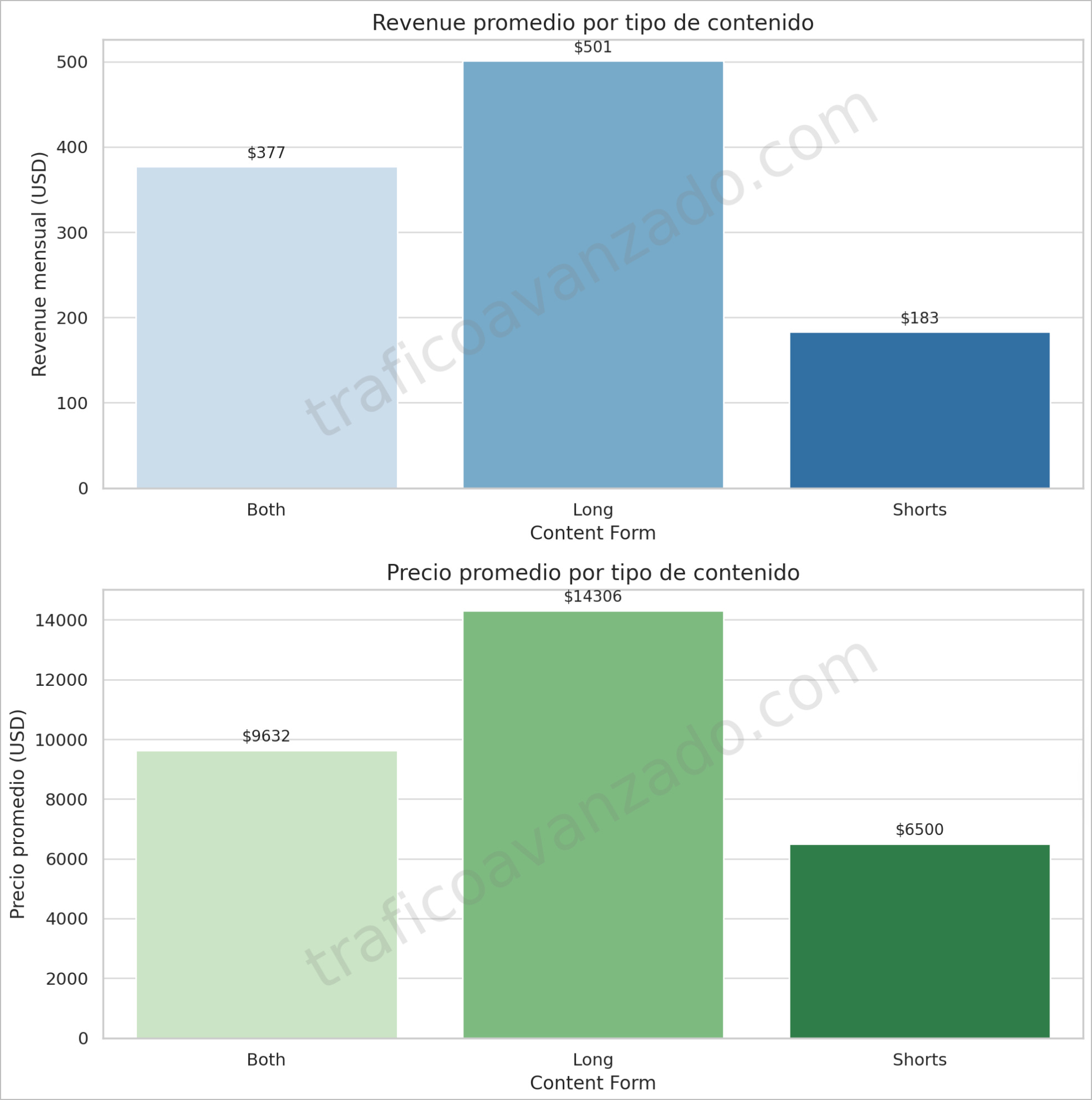 Los canales de contenido largo generan en promedio $500 dólares al mes, mientras que los que usan ambos tipos de contenido generan $377 dólares al mes y los que se enfocan solo en shorts generan $183 al mes.