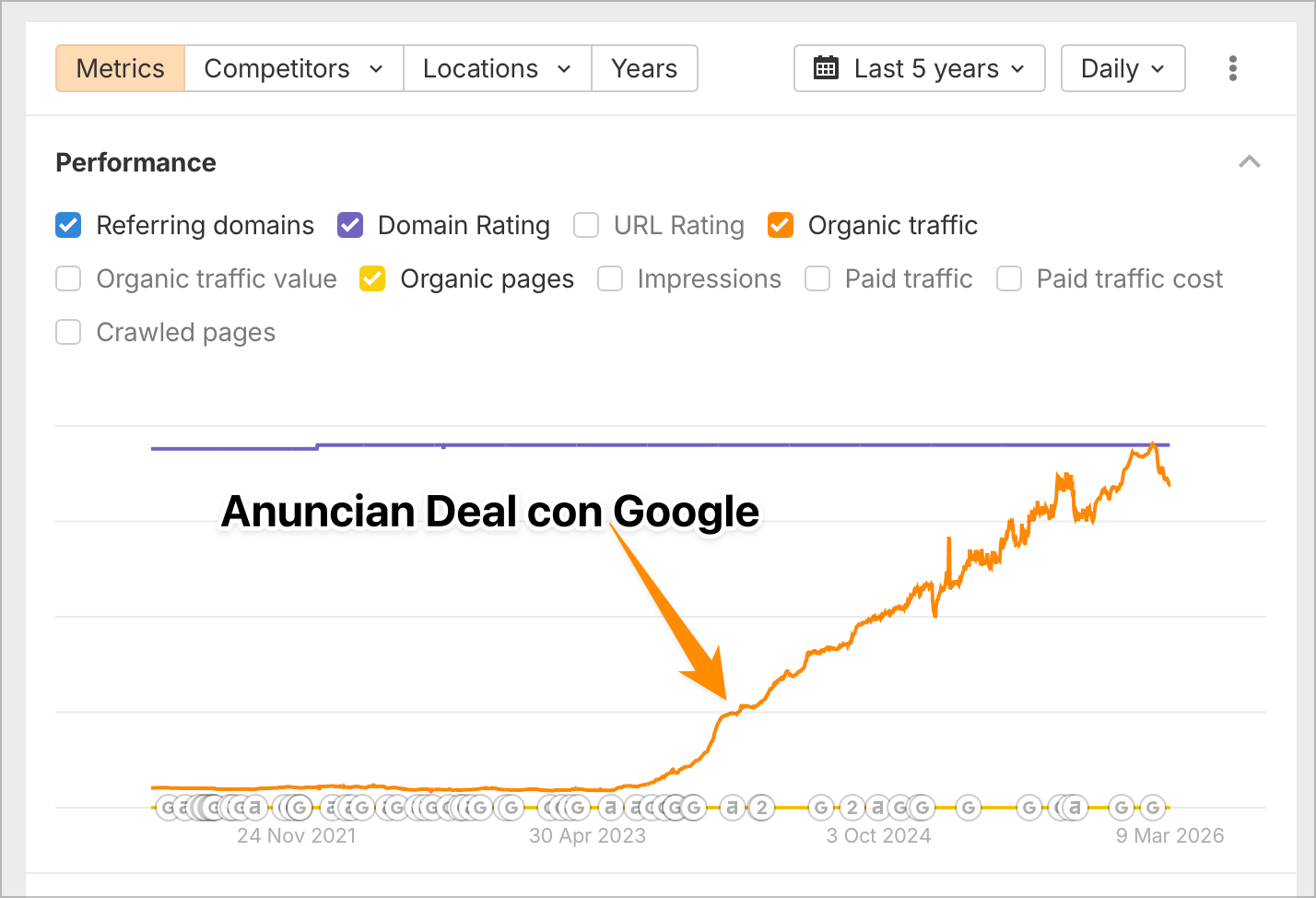 El cambio desde el anuncio del deal es tal vez un 4-5x, pero el beneficio se vio desde antes. Y eso es solo el tráfico orgánico de búsquedas. Pero claramente su tráfico directo, de marca y mucho más ha crecido muchísimo.