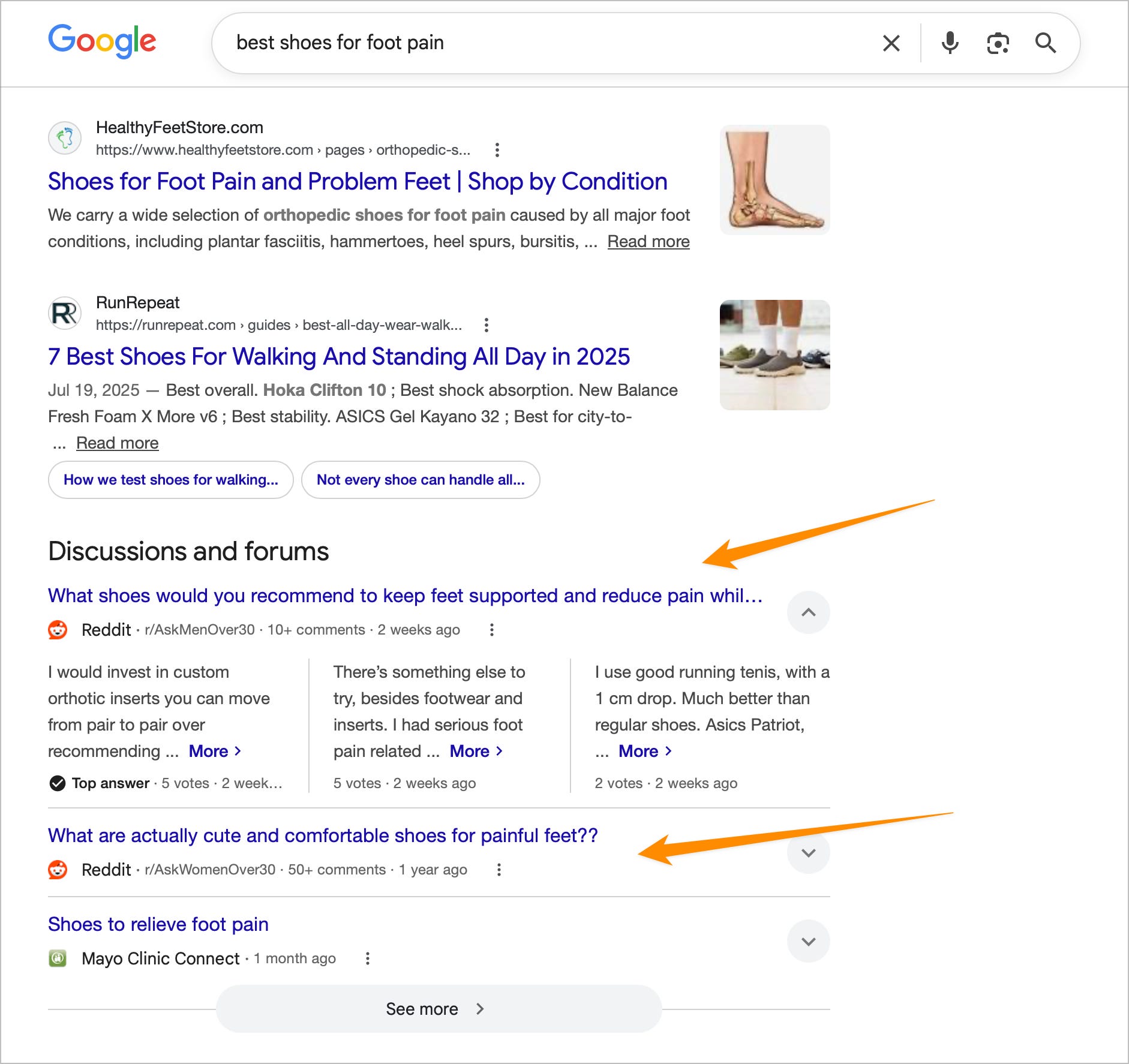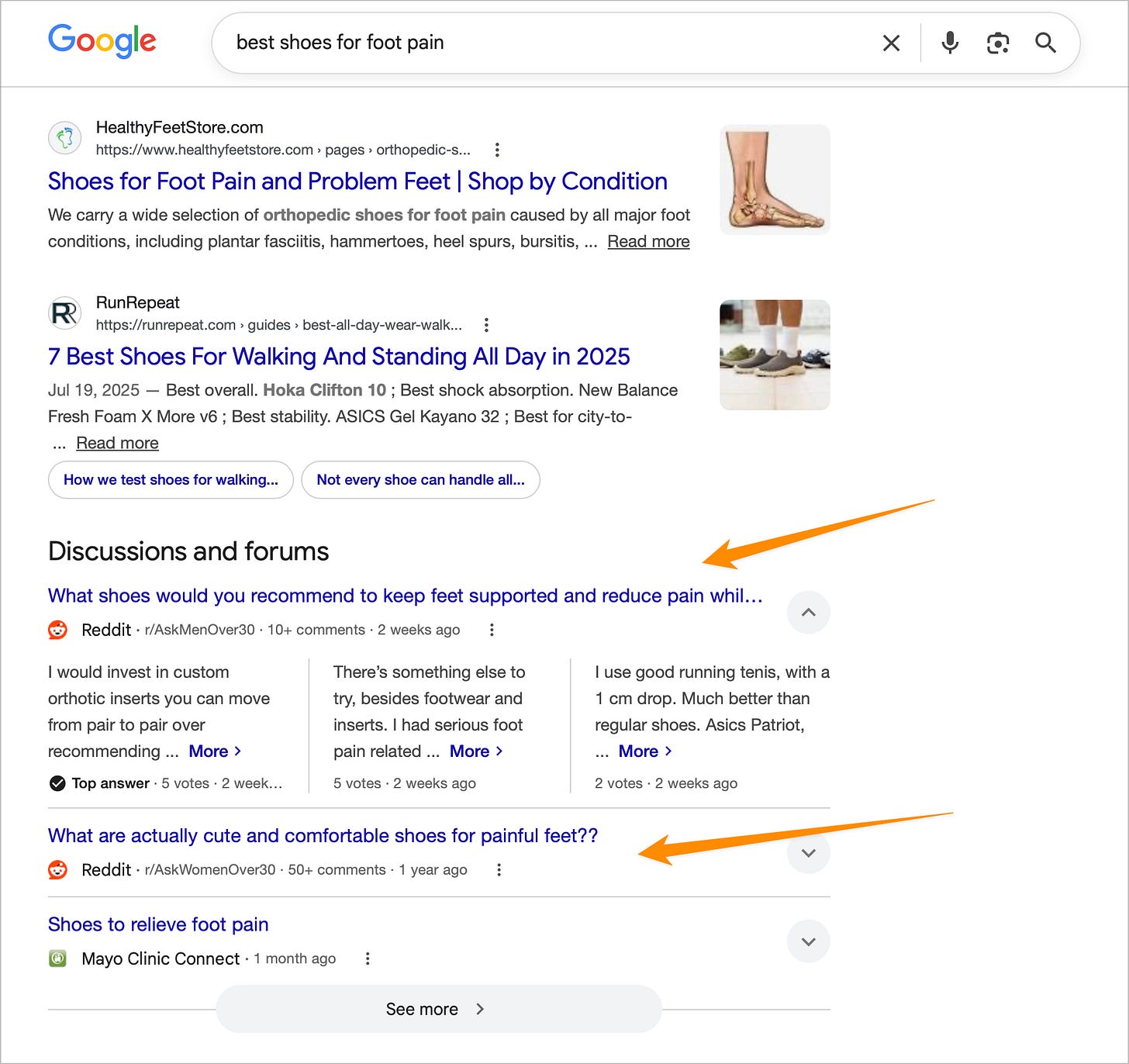 Basta con hacer una búsqueda típica transaccional (las que dejan $) para darse cuenta de que Reddit casi siempre figura entre los primeros 3 resultados. Aquí un ejemplo buscando los mejores zapatos para dolor de pie: